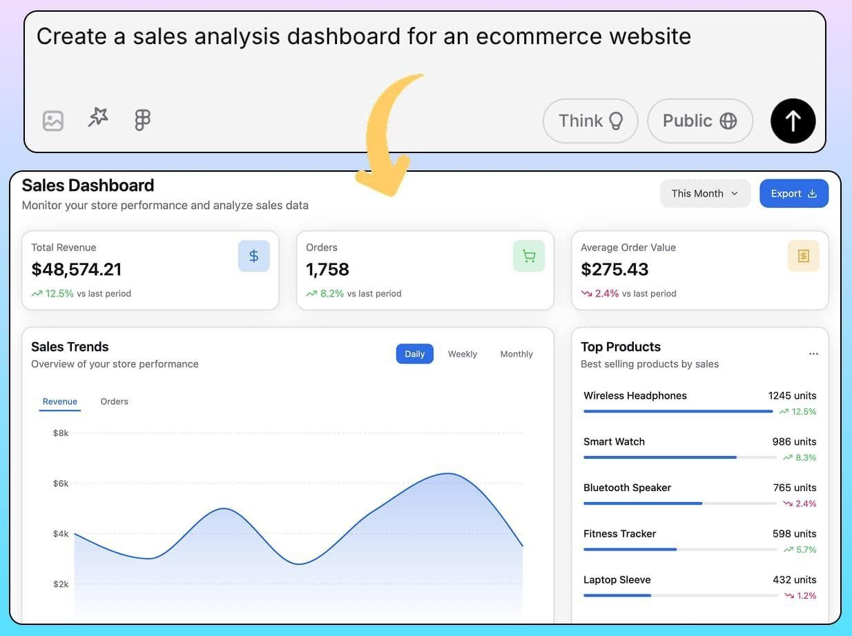 Mensaje de ejemplo: "Crear un panel de análisis de ventas para un sitio web de comercio electrónico".