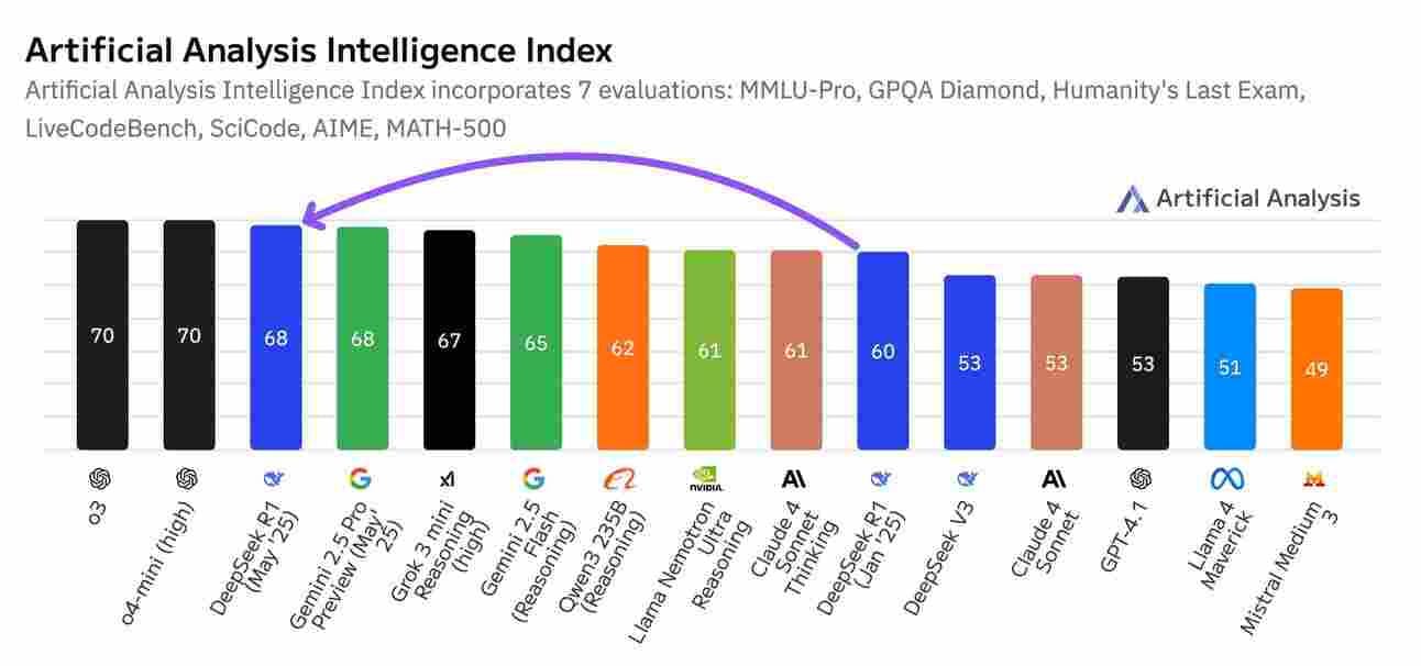 ¿Por qué? Según Artificial Analysis, que evalúa modelos en siete pruebas clave, este modelo ahora supera a Gemini 2.5 Pro de Google y a Claude 4 Sonnet de Anthropic. Esto lo coloca en un empate con o3 de OpenAI en el segundo puesto, solo por detrás de o4-mini (high). El avance se debe a mejoras significativas en programación, matemáticas y razonamiento científico.