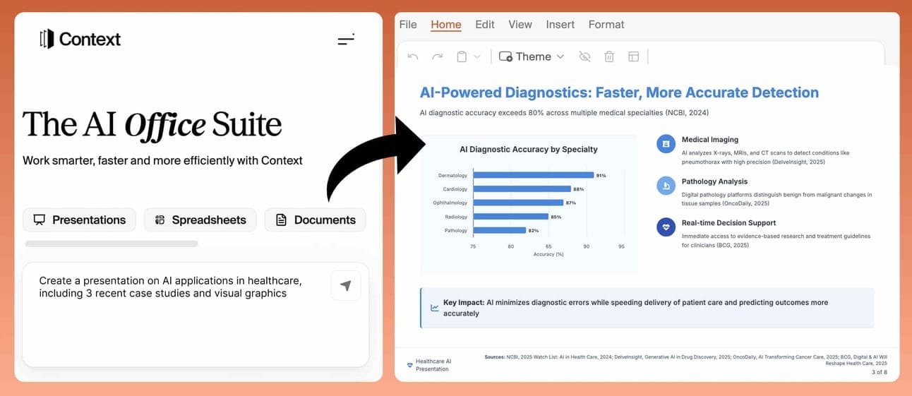 “Crea una presentación sobre aplicaciones de IA en salud, incluyendo 3 casos recientes y gráficos visuales.”En 15–20 minutos, Context generará una presentación completa con casos recientes y gráficos visuales.