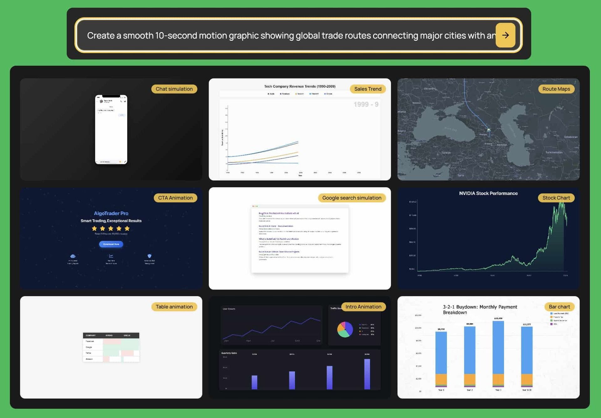 Ejemplo de prompt: "Crea un motion graphic fluido de 10 segundos que muestre las rutas comerciales globales que conectan las principales ciudades con líneas animadas y puntos brillantes".